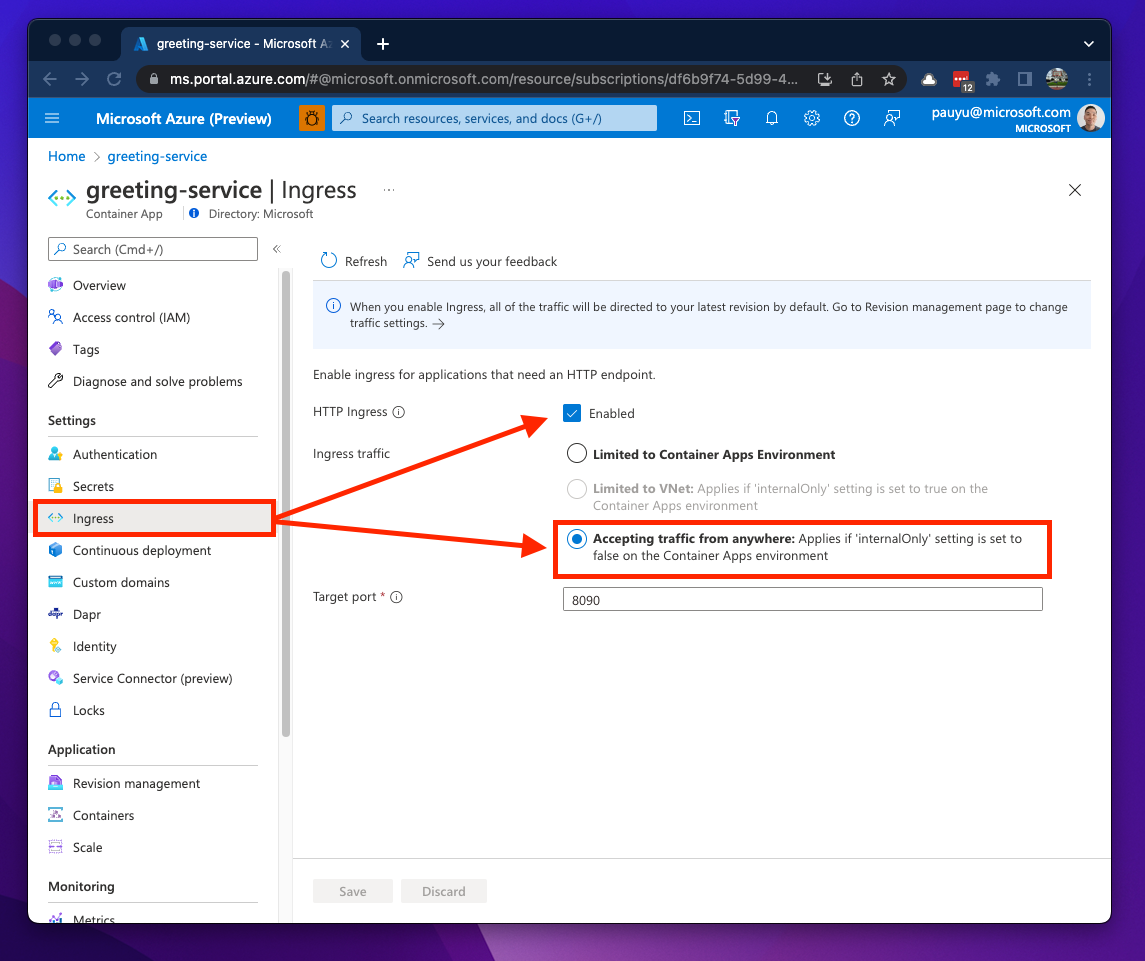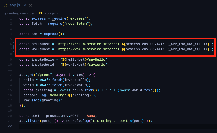 As you can see, the ingress feature enables communications to other container apps over HTTP/S and ACA will inject environment variables into our container to help determine what the ingress FQDNs would be. All we need now is a little bit of code modification in the greeting-service app and build the FQDNs of our backend APIs by retrieving these environment variables.