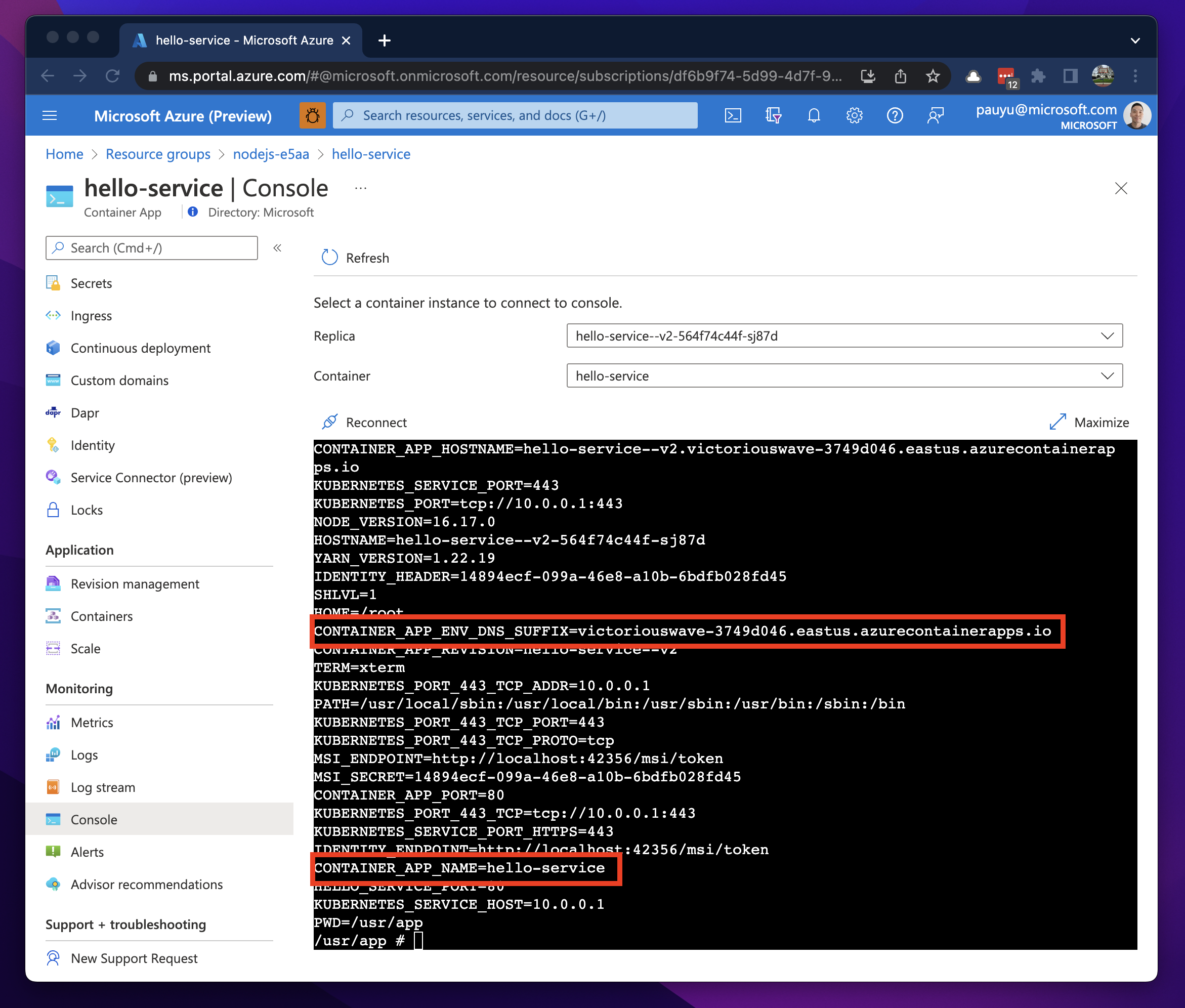 If I use the Console blade for the hello-service container app and run the env command, you will see environment variables named CONTAINER_APP_NAME and CONTAINER_APP_ENV_DNS_SUFFIX. You can use these values to determine FQDNs within your upstream app.