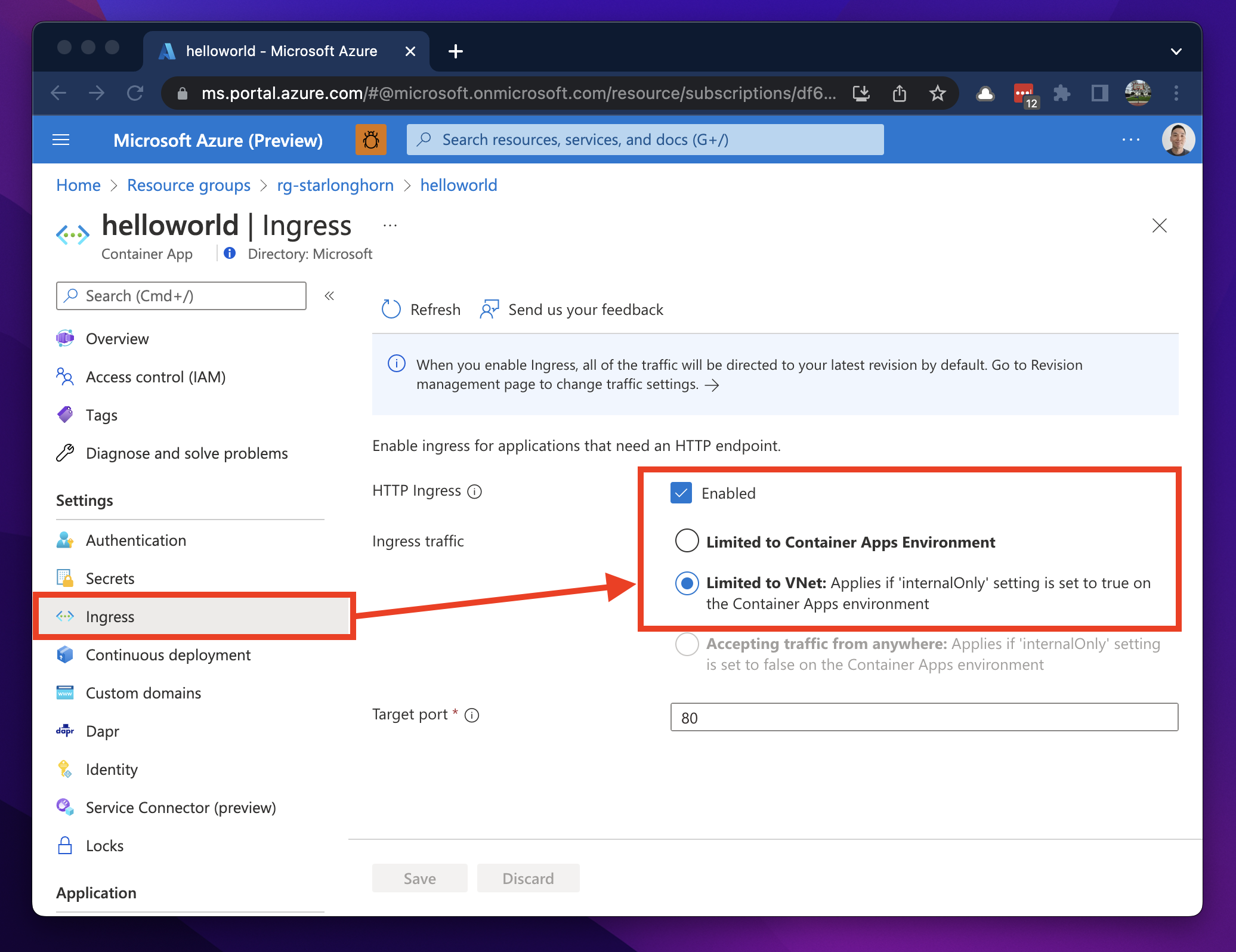 If your environment is deployed using default networking and your containers needs to be accessible from outside the environment, you will need to set the Ingress traffic option to Accepting traffic from anywhere. This will generate a Full-Qualified Domain Name (FQDN) which you can use to access your app right away. The ingress feature also generates and assigns a Secure Socket Layer (SSL) certificate for the FQDN.