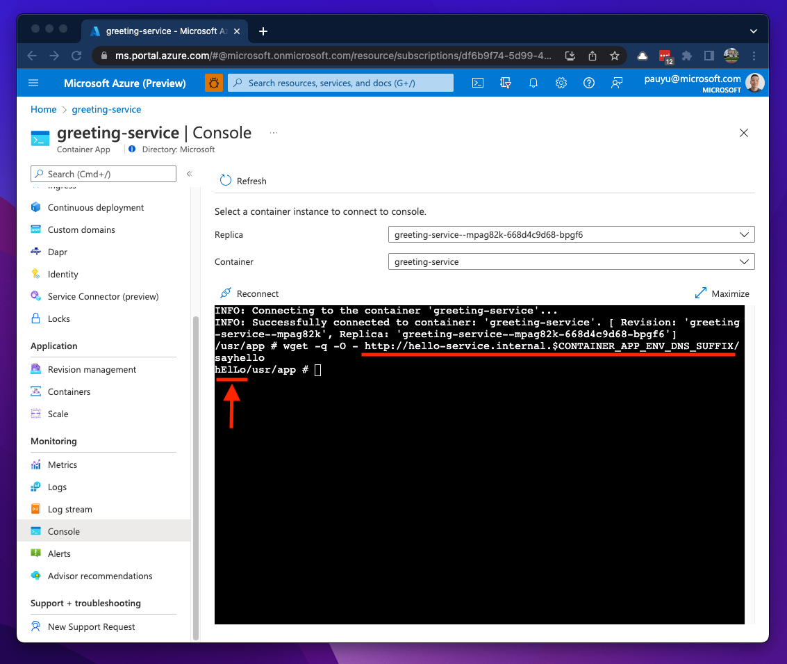 Back in the greeting-service container I can invoke the hello-service container’s sayhello method. I know the container app name is hello-service and this service is exposed over an internal ingress, therefore, if I add the internal subdomain to the CONTAINER_APP_ENV_DNS_SUFFIX I can invoke a HTTP request to the hello-service from my greeting-service container.