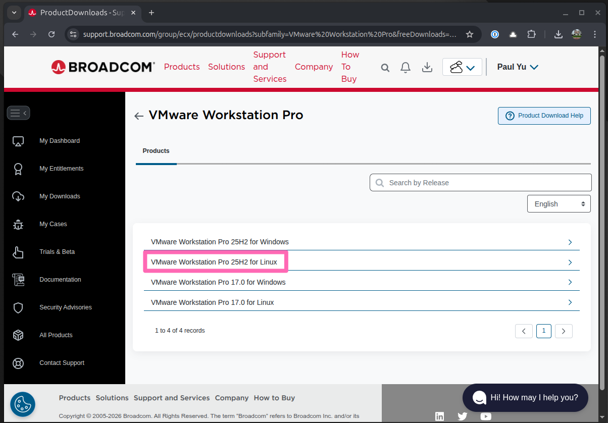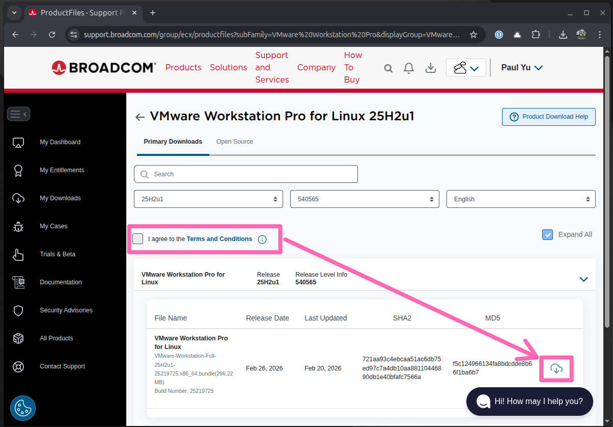 Anyway, the steps to install VMware Workstation Pro 25H2 on Ubuntu Desktop are pretty much the same as before. Head over to the Broadcom support site, sign in, and find VMware Workstation Pro. Expand VMware Workstation Pro 25H2 for Linux and click on the latest release.
