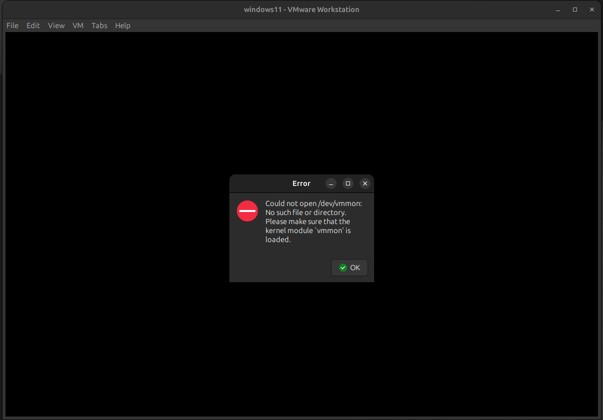 Create a new virtual machine (if you don’t have one already) and attempt to power it on. You should see an error message indicating that the vmmon and vmnet modules are not loaded.