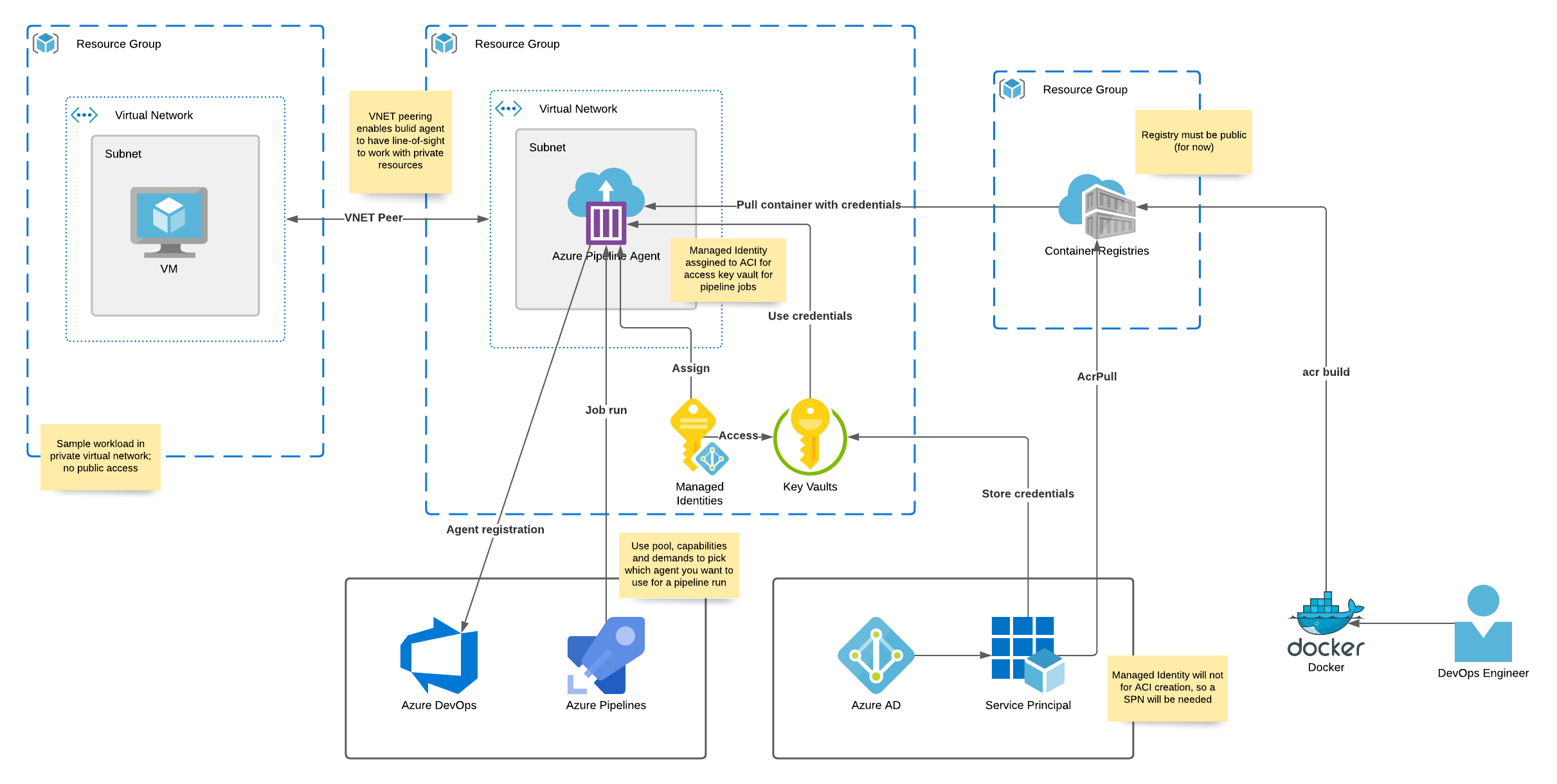 • The alternative is to run an agent in a Docker container and host it in Azure Container Instance which can run inside of the organization’s virtual network and we’ll explore this option for the rest of this guide.