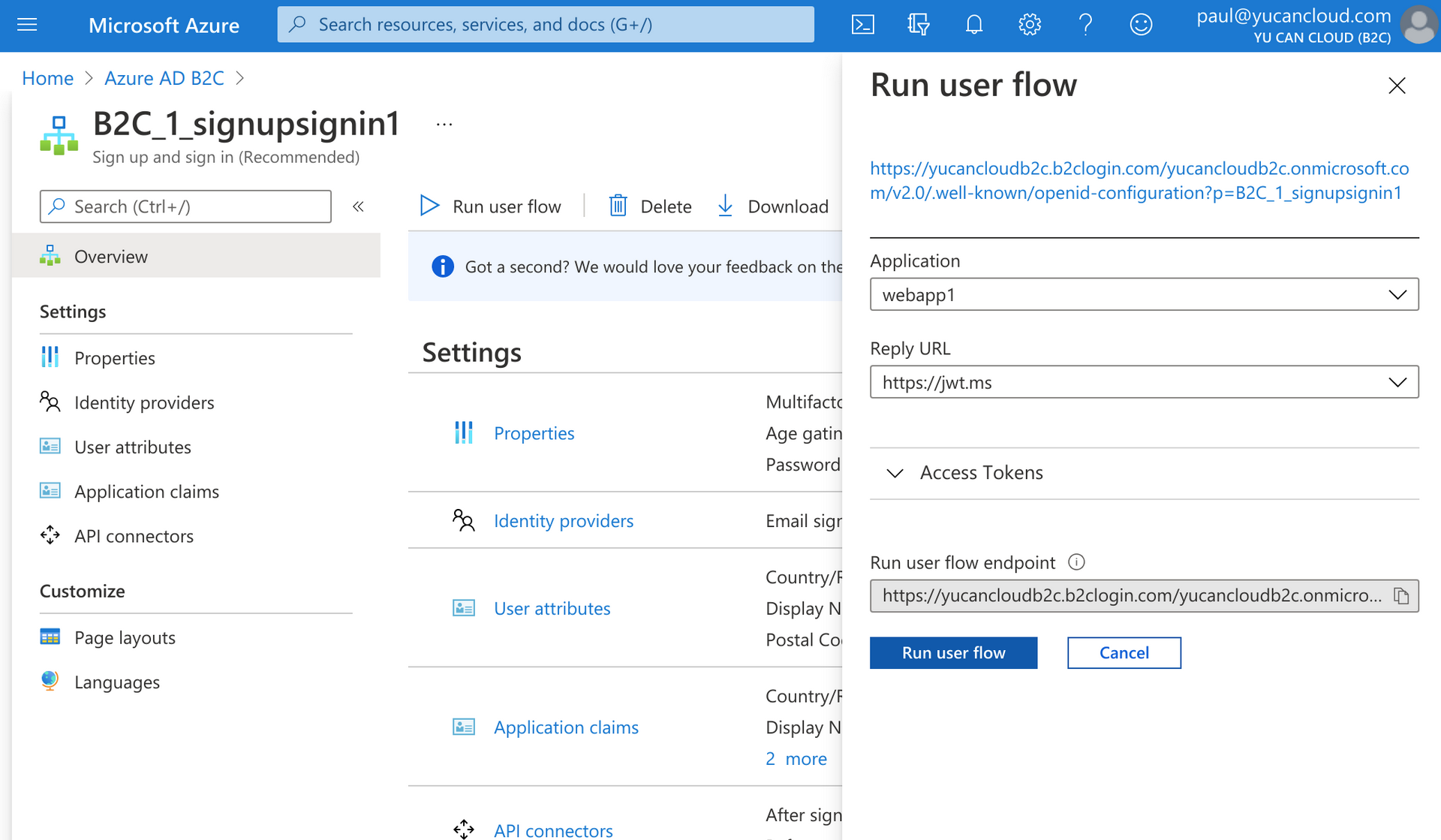 First, we’ll need a JWT so the easiest way to do this is to run a user flow. Here I am testing with my B2C_1_signupsignin1 user flow and against my webapp1 application which has been configured to redirect to https://jwt.ms.