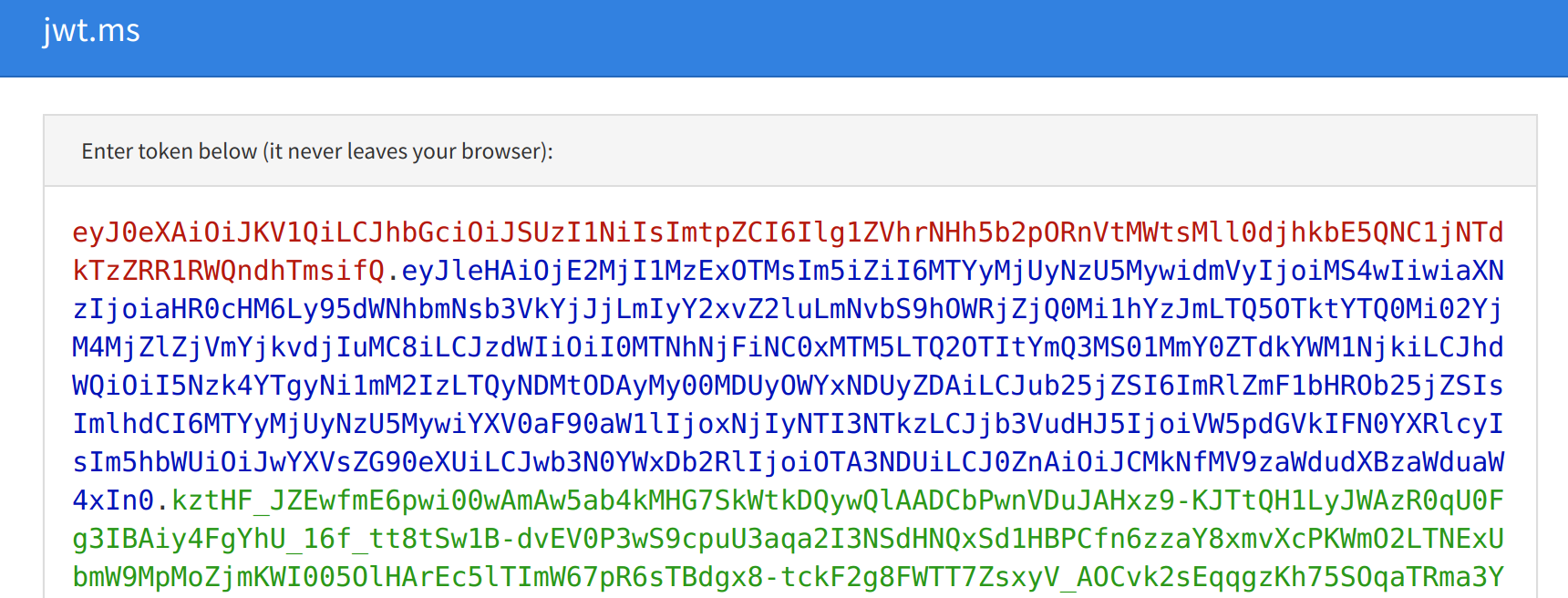 When folks want to validate the signature of a token, they’ll typically browse to https://jwt.io and paste in the access token to view the results.