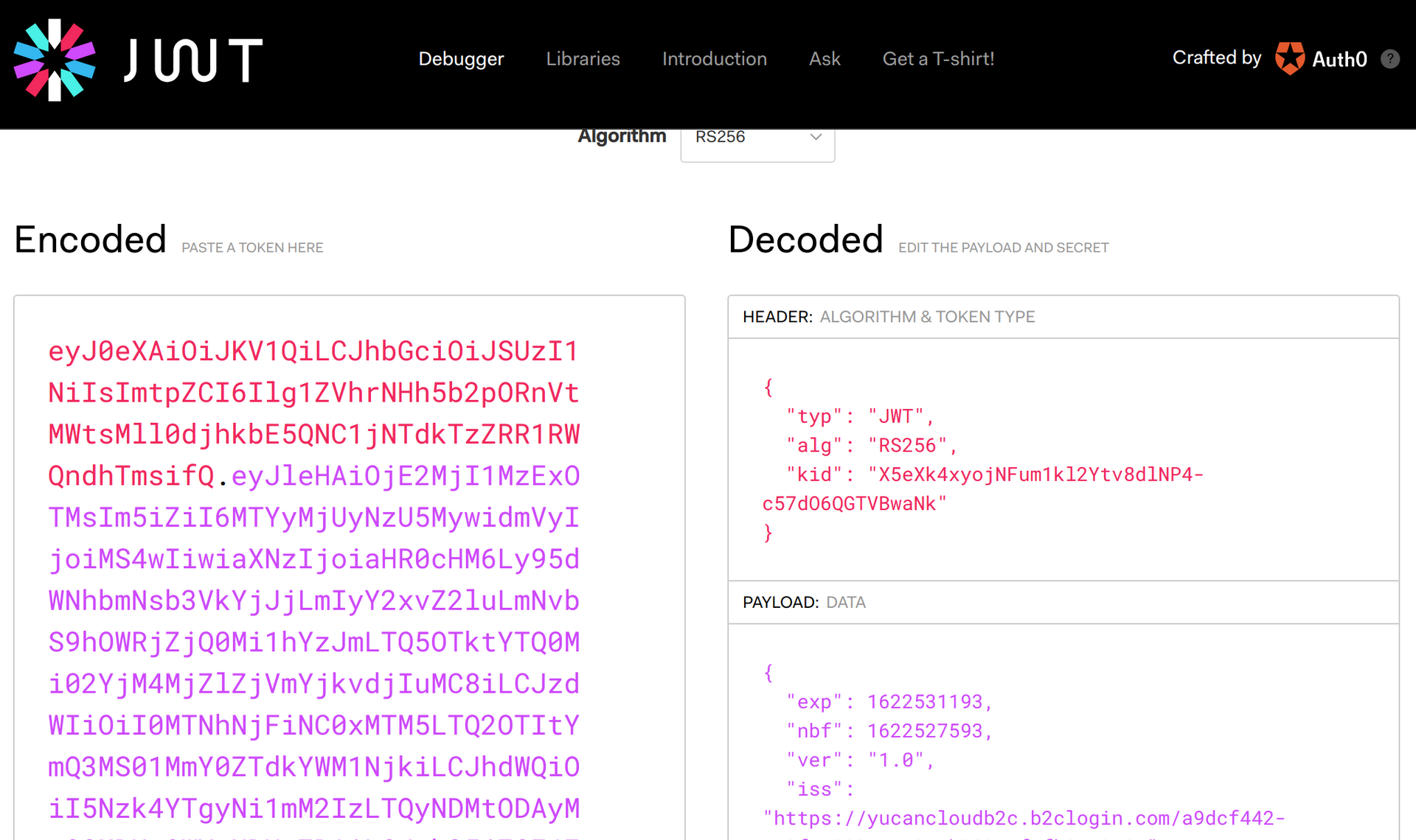 Now, browse to https://jwt.io and paste in your access token into the Encoded text box - where it says Paste a token here.