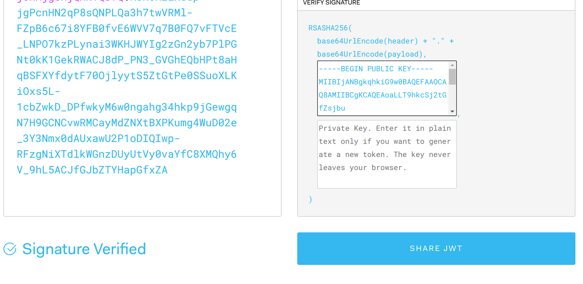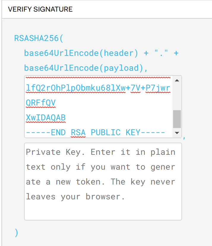 If you paste in your entire key from the discovery keys endpoint for your user flow and run the code, you will have a public key to enter in to jwt.io. Enter the public key into this textbox and the token’s signature will be validated.